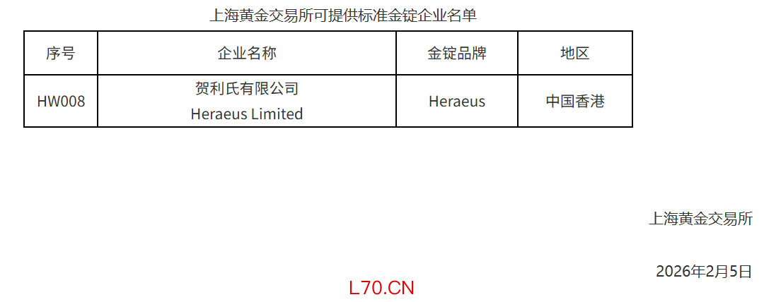 上海黄金交易所:新增贺利氏有限公司为境外可提供标准金锭企业