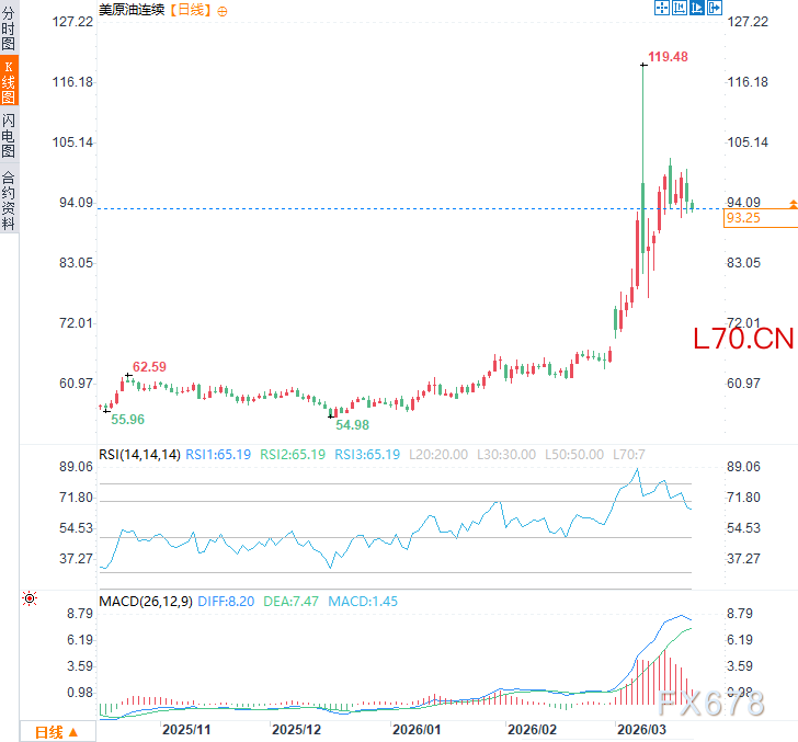 若冲突持续,盟友协调难度将进一步加大,全球能源通道安全与地缘稳定面临更高不确定性。周五亚市时段,美原油价格震荡下行,仍显著高于冲突爆发前水平,现交投于每桶93.25美元附近,日内跌幅约2.4%