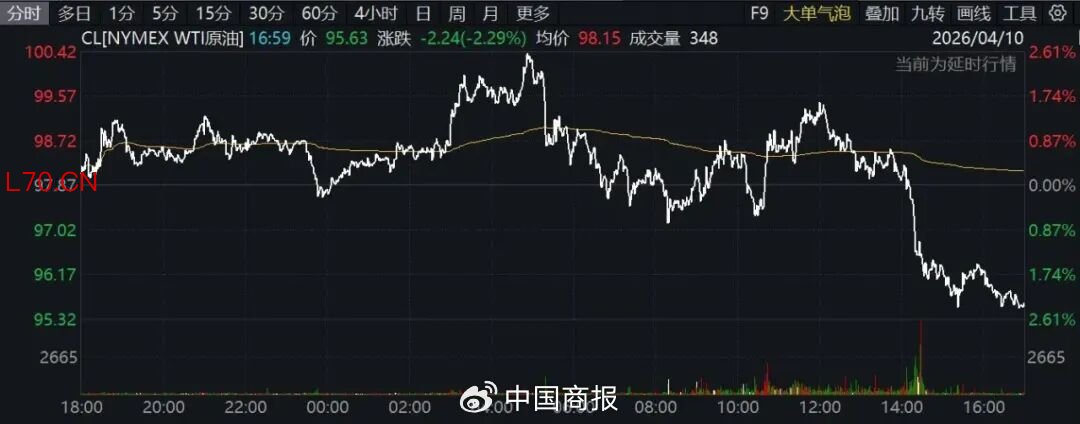 国际油价当天跳水。截至收盘,纽约商品交易所5月交货的轻质原油期货价格下跌1.30美元,收于每桶96.57美元,跌幅为1.33%;6月交货的伦敦布伦特原油期货价格下跌72美分,收于每桶95.20美元,跌幅为0.75%;WTI原油下跌逾2%。