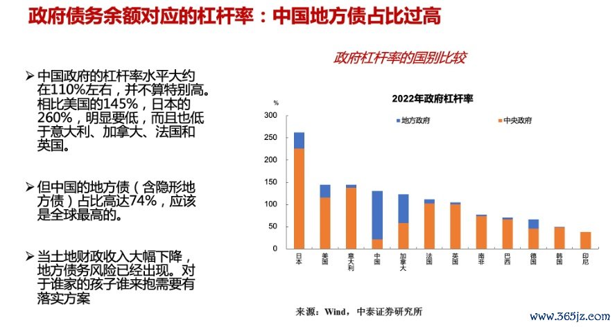 其次,我们需要从总量和结构两方面讨论资产负债表问题。从政府杠杆率总水平来讲,我国明显低于日本、美国等发达经济体,个人推算美国联邦政府加上州政府的杠杆率在145%左右,而我国加上隐形债后,中央加地方的杠杆率满打满算在110%左右,从国际比较看并不高。而且,从政府资产的角度看,债务的杠杆率水平就更低了。但我国的政府债务存在明显的结构性问题,即地方债占比过高,这与其他发达经济体的情况是相反的。