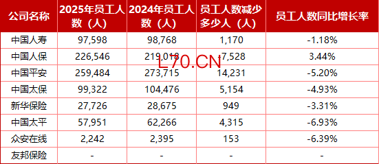 从规模看,中国平安以25.95万人仍居首位,但较2024年的27.37万人锐减14231人,同比降幅5.2%,是行业减员最狠的;