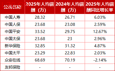 新华保险以32.85万元排第三,较2024年的31.32万元增加1.53万元,没有离退休人员负担,人均薪酬稳步提升;