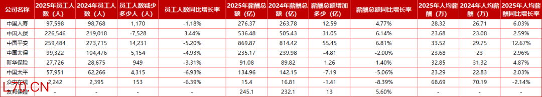 中国人保和中国太保并列第五,均为23.68万元,人保较2024年的23.08万元仅增0.6万元,扩编稀释了人均薪酬;