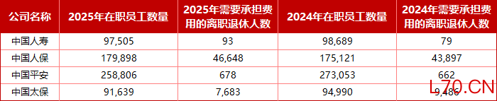 中国人寿、中国人保、中国平安、中国太保的员工总数=在职员工数量合计+需承担费用的离退休职工人数。