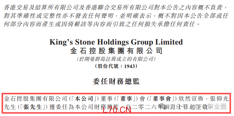 配资炒股2026年4月10日晚间股票配资专题,港交所上市公司金石控股集团(01943.HK)发布的公告显示,张仰光先生获委任为该公司财务总监,自二零二六年四月十日起生效。