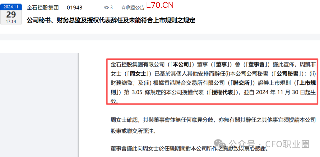 2024年11月29日,该公司发布公告称,周凯菲女士已基于其个人其他安排而辞任公司秘书、财务总监及公司授权代表。此后,公司未再发布关于财务总监聘任的相关公告。
