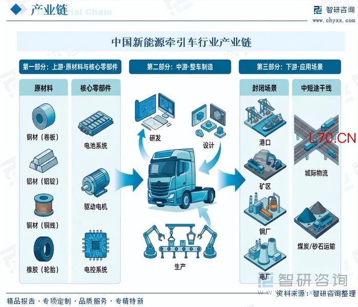 我国新能源牵引车产业链已形成上游原材料与核心零部件、中游整车制造、下游应用三大环节协同的完整生态,行业上游主要包括钢材、铝材、铜材、橡胶、绝缘材料等基础材料供应商以及动力电池系统、驱动电机系统、电控系统等核心零部件供应商;行业中游为新能源牵引车研发、设计、生产等环节;行业下游为应用市场,涵盖港口、矿区、钢厂、电厂等封闭场景,城际物流、煤炭/砂石运输等中短途干线等诸多领域。