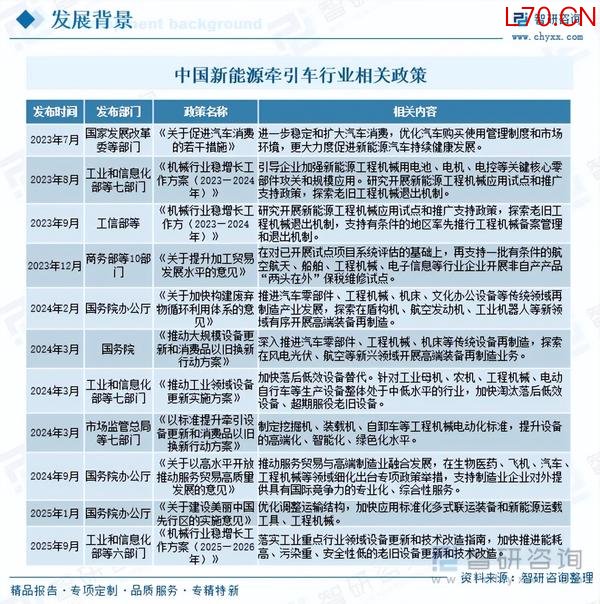 “双碳”目标、交通强国、大规模设备更新将新能源重卡纳入国家战略,近年来,我国相继发布《关于促进汽车消费的若干措施》《机械行业稳增长工作方案(2023—2024年)》《机械行业稳增长工作方(2023—2024年)》《关于提升加工贸易发展水平的意见》《关于加快构建废弃物循环利用体系的意见》《推动大规模设备更新和消费品以旧换新行动方案》《推动工业领域设备更新实施方案》《以标准提升牵引设备更新和消费品以旧换新行动方案》《关于以高水平开放推动服务贸易高质量发展的意见》《关于建设美丽中国先行区的实施意见》《机械行业稳增长工作方案(2025—2026年)》等一系列政策引导牵引车行业往绿色低碳方向发展,为我国新能源牵引车行业发展提供了良好的政策环境。