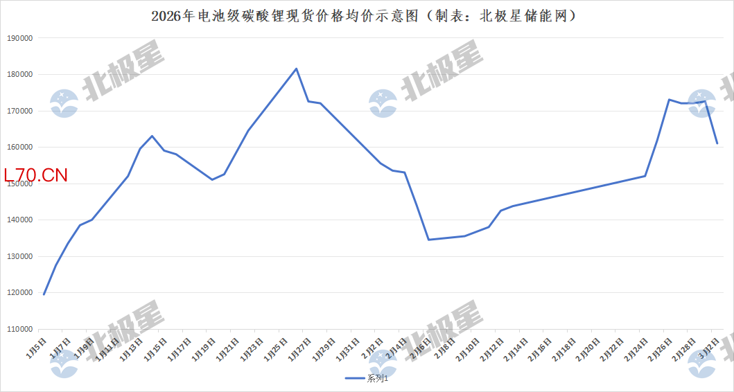 北极星储能网讯:2026年3月3日,公开平台显示,电池级碳酸锂现货价格均价断崖式下降了1.15万/吨,降至16.1万元/吨,降幅6.67%。