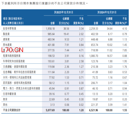 2023年至2025年,该行连续3年甩卖百亿级信贷资产,其中绝大多数为房地产相关不良资产。财报显示,该行房地产行业不良率从2023年末的5.94%大幅降至2025年末的0.84%,不良贷款额从31.57亿元骤降至4.02亿元。公司贷款整体不良率也从2020年末的2.31%降至1.20%,踩中恒大地产、鸿达兴业集团等多个“雷点”后的大幅压降,显示出管理层化解历史包袱的决心。