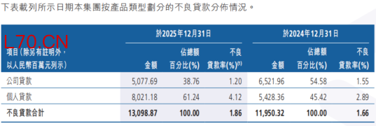 然而,在个人端,不良率急速攀升成为了新的风险隐患。数据显示,2020年末至2025年末,该行不良个人贷款率从1.09%攀升至4.12%,个人不良贷款余额更是从15.33亿元激增至80.21亿元,5年间增长了4.23倍。