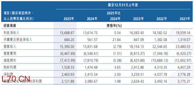 从细分业务看,2025年,作为该行收入支柱的利息净收入为136.89亿元,同比微增0.54%,占营收比例达88.95%;手续费及佣金净收入同比增长21.84%至6.84亿元,绝对规模仍处于近十年低位,占营业收入的比重为4.45%。