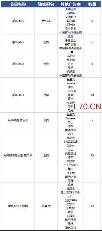 回顾《乘风》系列从第一季到2026年的商业化历程,可以清晰地看到几个重要变化。首先是广告主数量的起伏:第一季为13家,第二季达到历史峰值的15家,第三季骤降至5家,第四季回升至10家,第五季为8家,2025年再次触底至5家,2026年则回升至8家,整体呈现出一条高位开局、冲高回落、低位震荡、缓慢恢复的曲线。